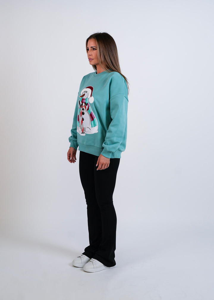 Tohle je nejstylovější sněhulák sezóny – s candy hůlkou, proužkovanou šálou a výraznou 3D výšivkou, která dělá z celé mikiny absolutní vánoční must-have.